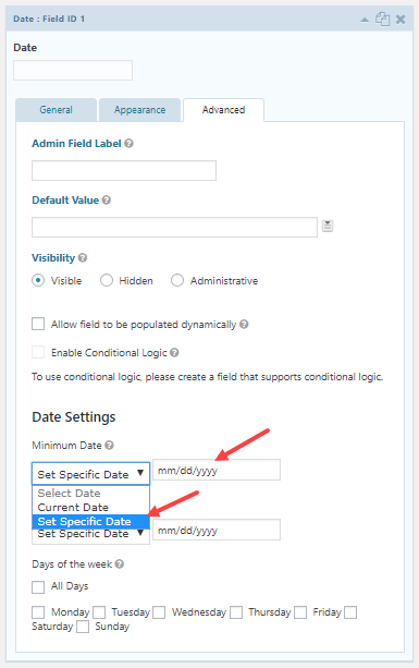 Step 4: Here, admin can set the Minimum Date, Maximum Date, and Days of the Week according to their requirements.